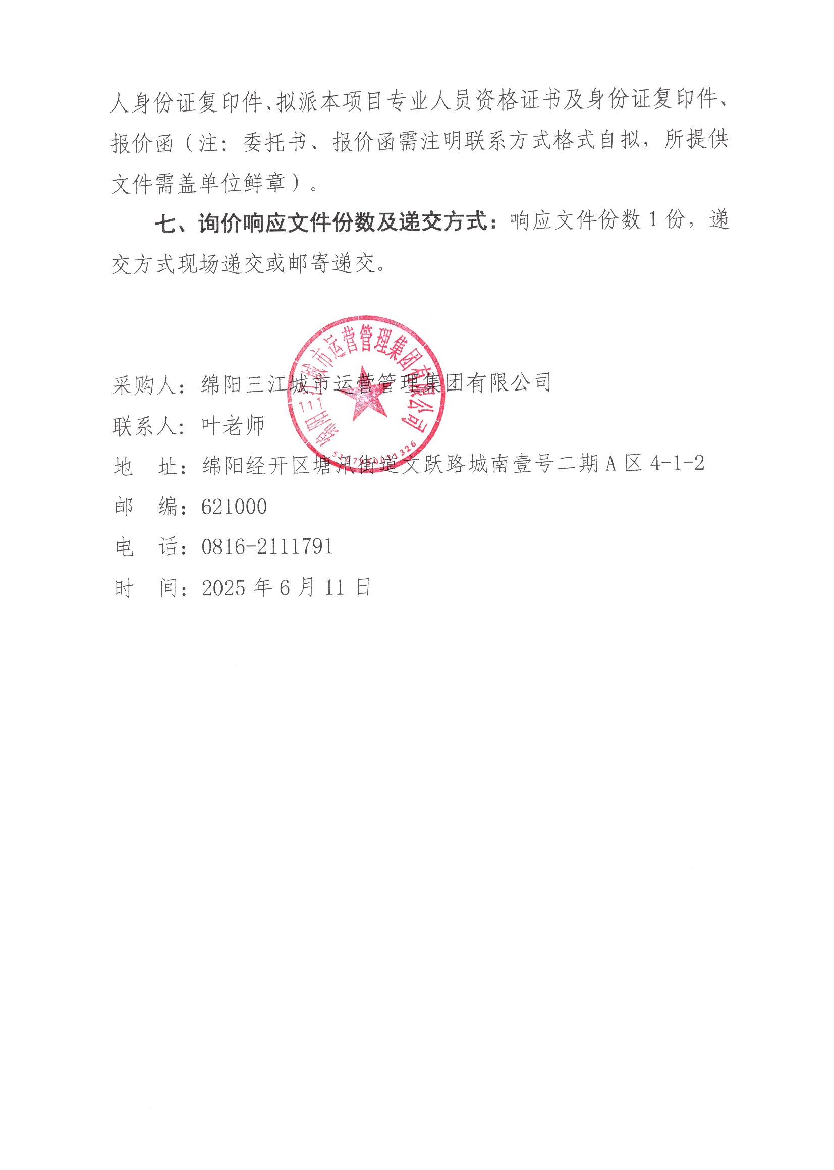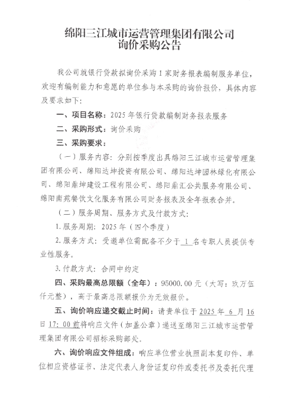 绵阳三江城市运营管理集团有限公司询价采购公告