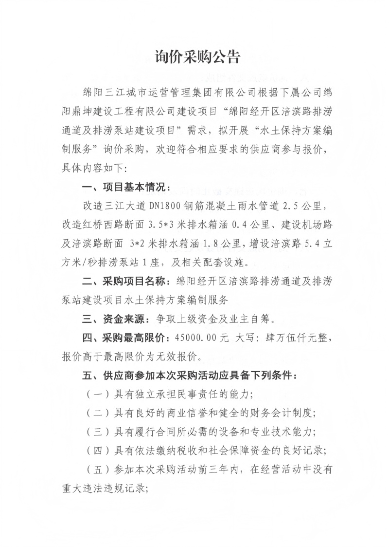 涪滨路排涝水土保持方案编制询价采购公告
