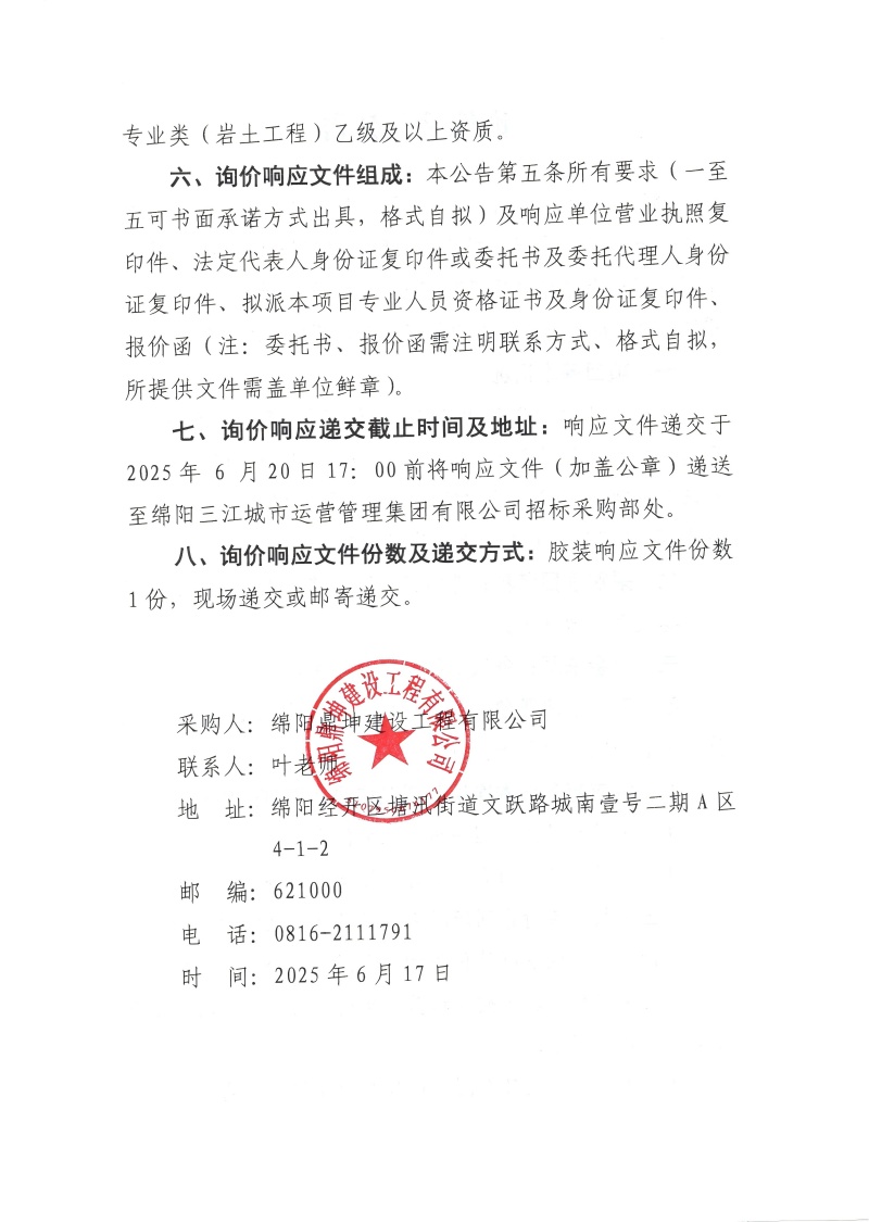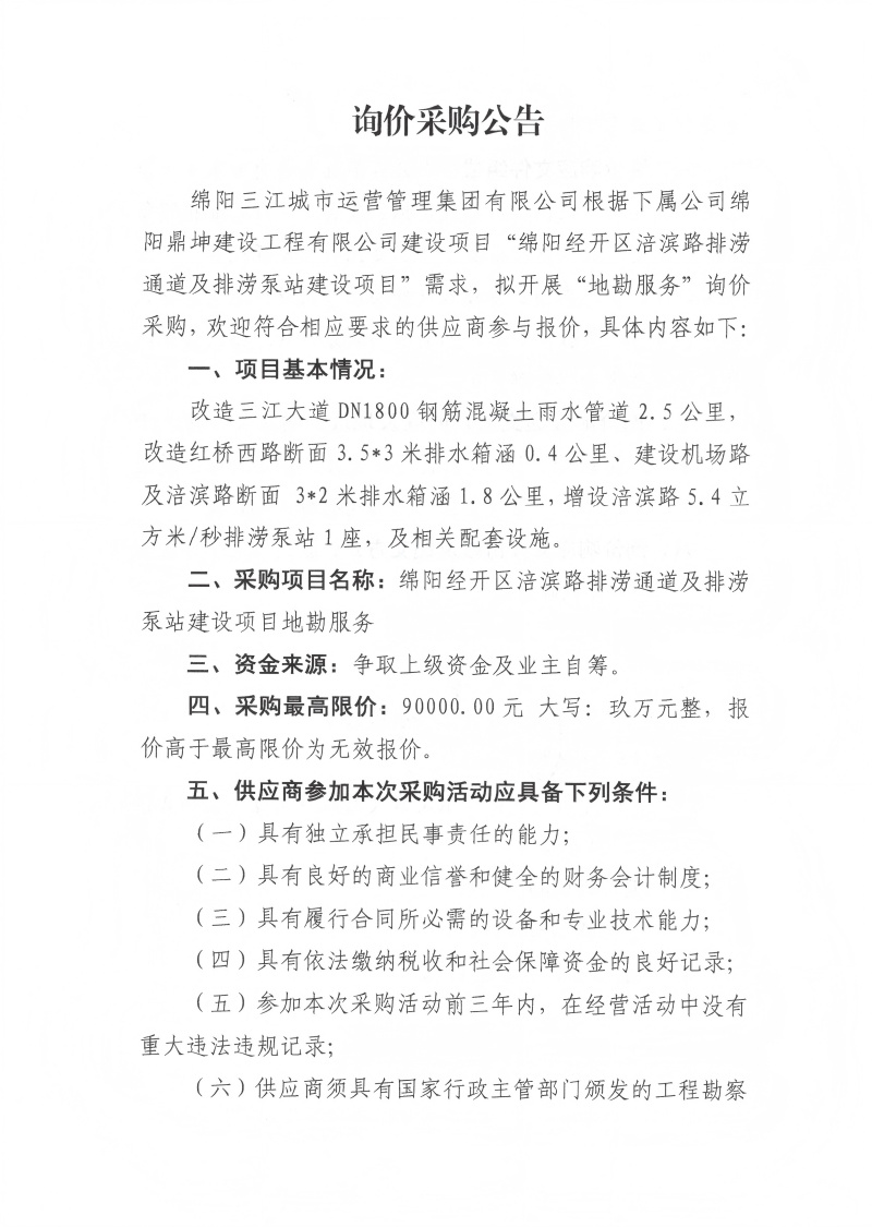 绵阳经开区涪滨路排涝通道地勘服务询价采购公告